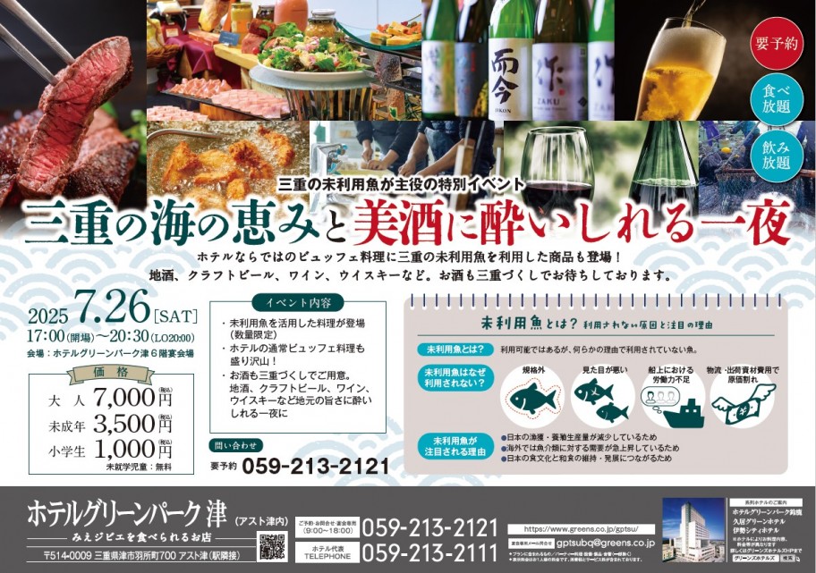 ■イベント概要 ・イベント名:三重の海の恵みと美酒に酔いしれる一夜 ~未利用魚の活用と魚介の食育&三重の地酒~ ・開催日:2025年7月26日(土) ・時間:17:00~20:30(L.O 20:00) ・会場:ホテルグリーンパーク津6F「伊勢・安濃の間」 ・料金:大人7,000円(税込)/未成年(中学生以上)3,500円/小学生1,000円/未就学児無料 ・予約:お電話・メールにてご予約を承っております。 何か不明点等がある場合にもこちらにご連絡くださいませ。 ☎ 059-213-2121(受付時間 9:00~18:00) ✉ gptsubq@greens.co.jp ■未利用魚とは? “未利用魚”とは、味は優れているにも関わらず、サイズが不揃い、知名度が低い、調理が難しいなどの理由で市場に出回らず、これまで廃棄されてきた魚のことです。三重県沿岸ではアイゴが代表的で、以前は“食害魚”として扱われることもありました。 現在、日本全体の漁獲・養殖生産量は減少傾向にあり、一方で海外では魚介類への需要が急増しています。そうした中で、未利用魚は和食文化の維持・発展にも資する新たな食資源として、いま注目を集めています。 今回のイベントでは、こうした未利用魚を“もったいない”から“おいしい”へと変える調理法や活用方法をご紹介します。 ■主な内容 ・ビュッフェ形式:未利用魚を使用したアレンジ料理、 三重の地の魚料理 ホテルシェフによる日本酒・ビールに合せた料理 ・フリードリンク:三重の地酒・クラフトビール・ソフトドリンク