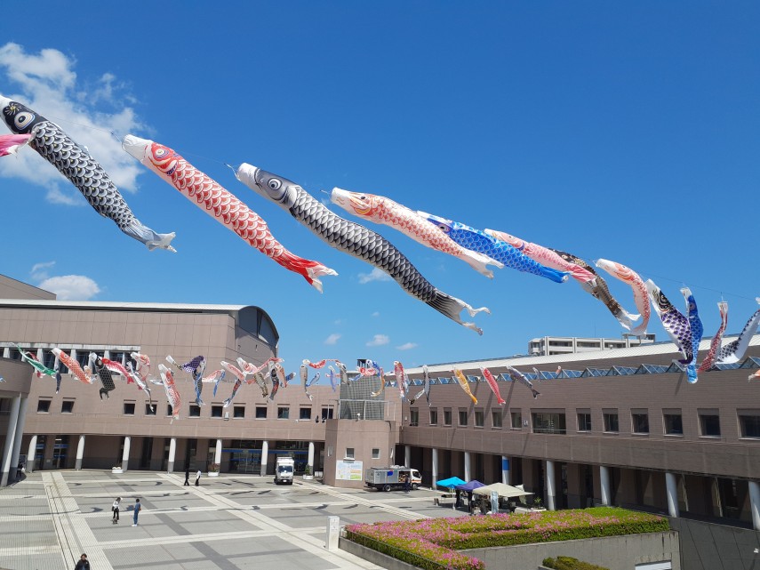 広場とメインエントランスに150匹を超えるこいのぼりが