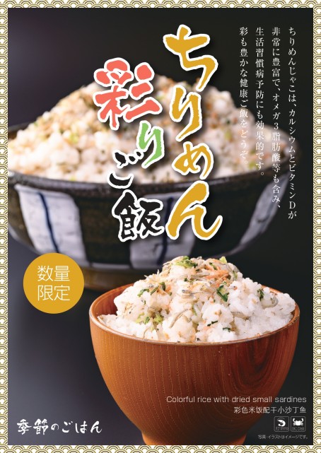 | 3月随時開始 「ちりめん彩りご飯」 | ちりめんじゃこはカルシウムやビタミンDが豊富で、毎日の元気を支えてくれる栄養たっぷりの食材です。 彩り豊かな具材とともに、やさしく滋味深い味わいに仕上げました。 一日の始まりに、春を感じる健やかな一杯をぜひお楽しみください。 期間限定の季節メニューです。 無くなり次第終了させていただきます。 予めご了承ください。 |
