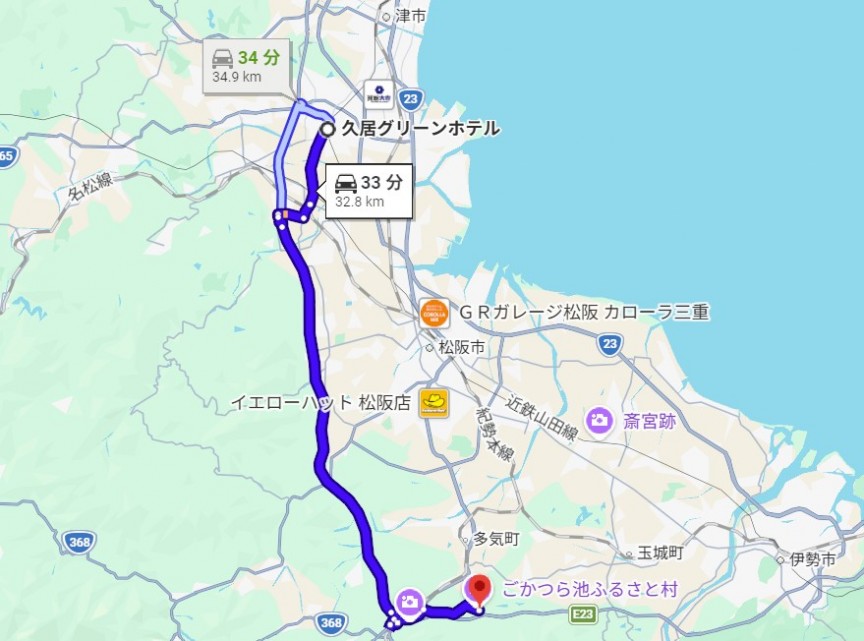 ▼久居グリーンホテルからごかつら池どうぶつパーク車でのアクセスはこちら