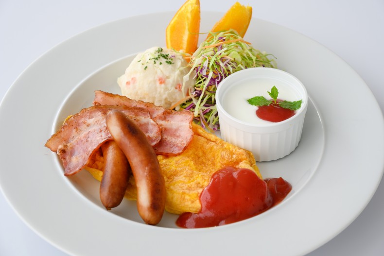 ふんわりと焼き上げたオムレツにジューシーなベーコンとソーセージを添え、彩り豊かなフレッシュサラダと滑らかなヨーグルトを組み合わせました。