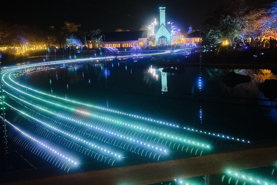 ・水上イルミネーション「光の大河」:日本最大級、光が水面に映る絶景