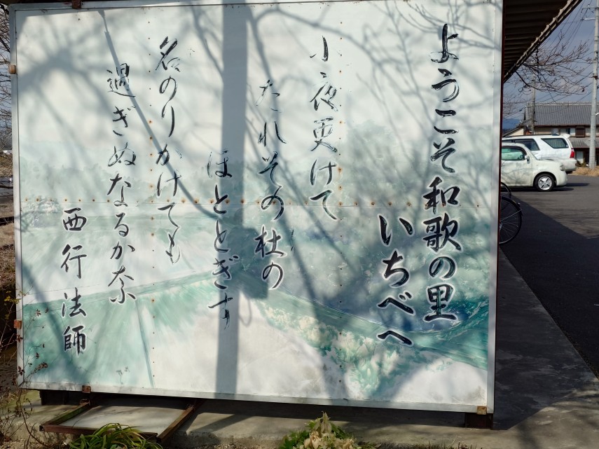 市部(いちべ)駅に降り立つと、まず出迎えてくれるのが西行法師の歌が書かれた看板です。