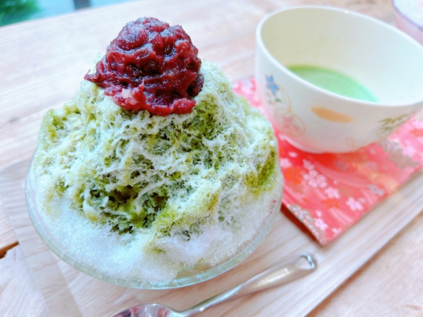 いただいたのは「抹茶小松菜アボカド氷」に、練乳と小豆をトッピング!