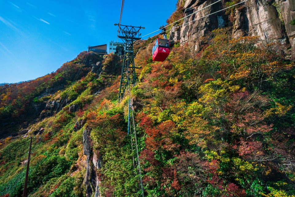 御在所岳は標高1,212m。ロープウェイに乗れば、色鮮やかな紅葉を眼下に眺めながら空中散歩を楽しめます。