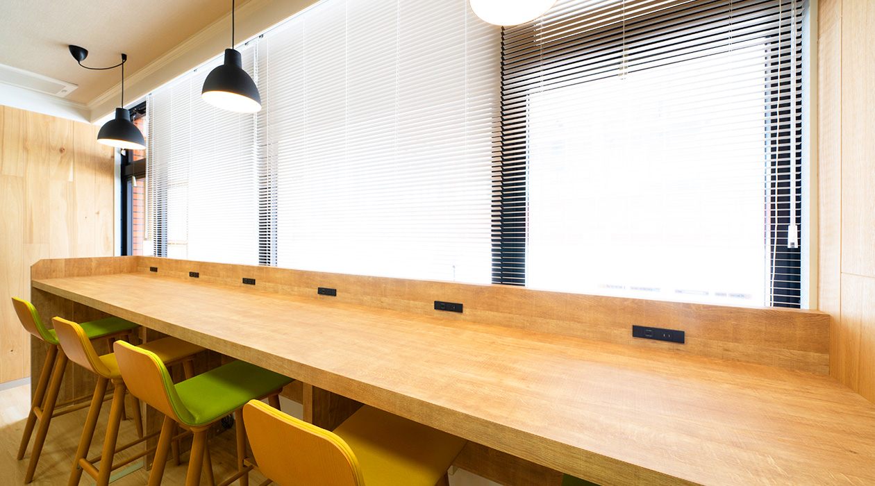 木のぬくもりを感じる落ち着いた雰囲気。仕事も勉強も、気分を変えたい時や