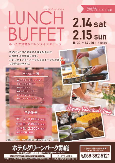 | プラン内容 | ・ビュッフェ料理 ・飲み放題2時間 (瓶ビール、ウイスキー、梅酒、ウーロン茶、 ジュース各種、ノンアルコールビール) ・会場のセッティング及び現状復旧 ・ホテルスタッフによる会場内サービス ※その他オプションにつきましてはご相談承ります。 ※別途費用として出張料が飲食の10%かかります。 ※出張可能エリアは鈴鹿市、亀山市です。その他のエリアはご相談ください。 ※状況によりご予約をお受けできない場合があります。 |