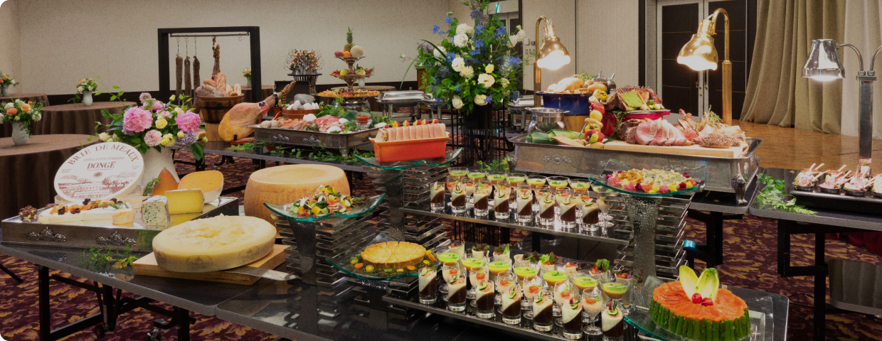 華やかな旬の食材を使用した料理と心温まるサービスで、特別なひとときを演出。洋食ビュッフェスタイルから卓上大皿料理、和食会席・洋食コース、和洋コースまでご利用目的に合った宴会料理をご提供いたします。