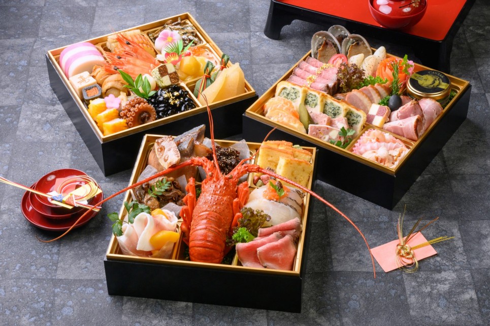 志摩産伊勢海老、松阪肉ローストビーフ、松坂肉しぐれ煮 鳥羽浦村産牡蠣しぐれ煮、三重豚ロースハム、 三重県産真鯛の燻製、三重県産ぶりの照り焼きなど三重県の食材と