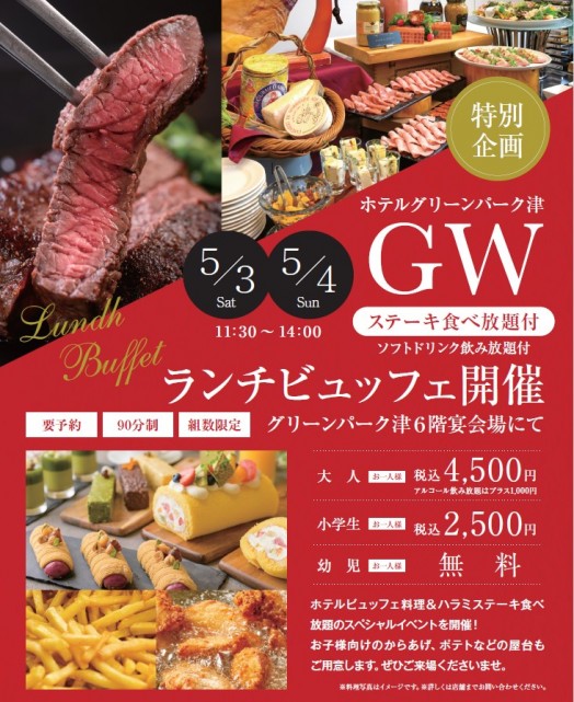 ■イベント概要 ・イベント名:GW限定ランチビュッフェ ・開催日:2025年5月3日(土)4日(日) ・時間:11:30~14:00 ・会場:ホテルグリーンパーク津6F ・料金:大人4,500円(税込)/子ども(中学生未満)2,500円/未就学児 無料 ・予約:お電話・メールにてご予約を承っております。 何か不明点等がある場合にもこちらにご連絡くださいませ。 ☎ 059-213-2121(受付時間 9:00~18:00) ✉ gptsubq@greens.co.jp ■主な内容 ・ビュッフェ形式:ホテルシェフ和洋ビュッフェ+ハラミステーキ食べ放題 ・ホテルオリジナルスイーツブランドGrissier(グリシエ)のスイーツ食べ放題 ・フリードリンク