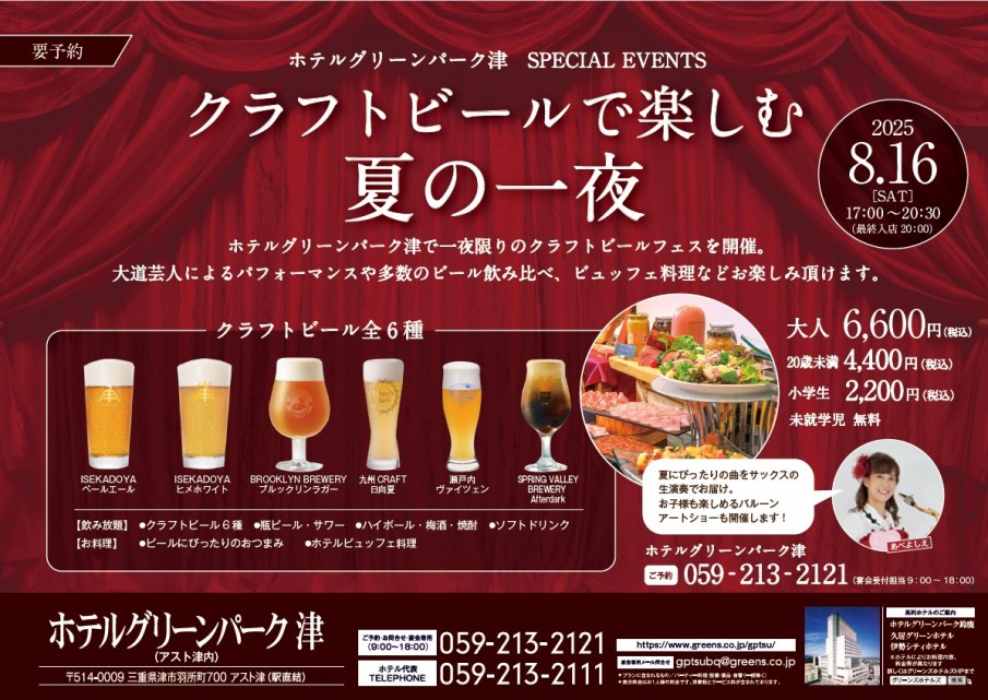 ■イベント概要 ・イベント名:クラフトビールで楽しむ夏の一夜 ・開催日:2025年8月16日(土) ・時間:17:00~20:30(L.O 20:00) ・会場:ホテルグリーンパーク津6F「伊勢・安濃の間」 ・料金:大人6,600円(税込)/未成年(中学生以上)4,400円/小学生2,200円/未就学児無料 ・予約:お電話・メールにてご予約を承っております。 何か不明点等がある場合にもこちらにご連絡くださいませ。 ☎ 059-213-2121(受付時間 9:00~18:00) ✉ gptsubq@greens.co.jp ■ホテルグリーンパーク津で一夜限りのクラフトビールフェスを開催。 大道芸人によるパフォーマンスや多数のビール飲み比べ、ビュッフェ料理などお楽しみ頂けます。 ■主な内容 ・ビュッフェ形式:ホテルシェフによるビールに合せた料理 ・フリードリンク:クラフトビール中心にその他アルコール飲料・ソフトドリンク ・大道芸人によるパフォーマンス