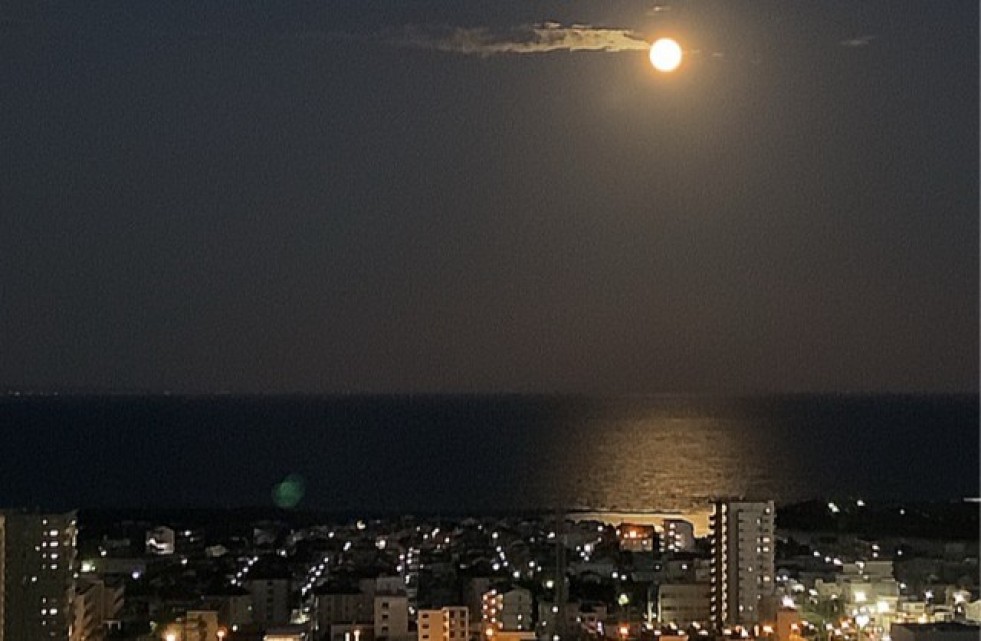 写真はお部屋の窓から撮ったのですが、明るい月が伊勢湾を照らす様と