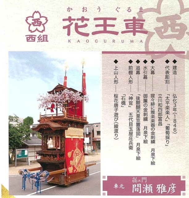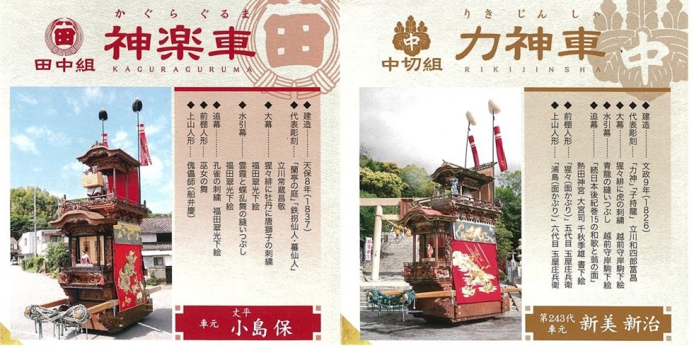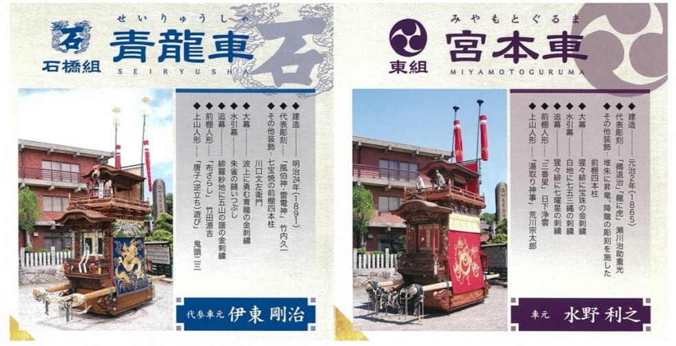 それぞれ石橋組の青龍車、東組の宮本車、田中組の神楽車、中切組の力神車、西組の花王車と呼ばれる5台で、