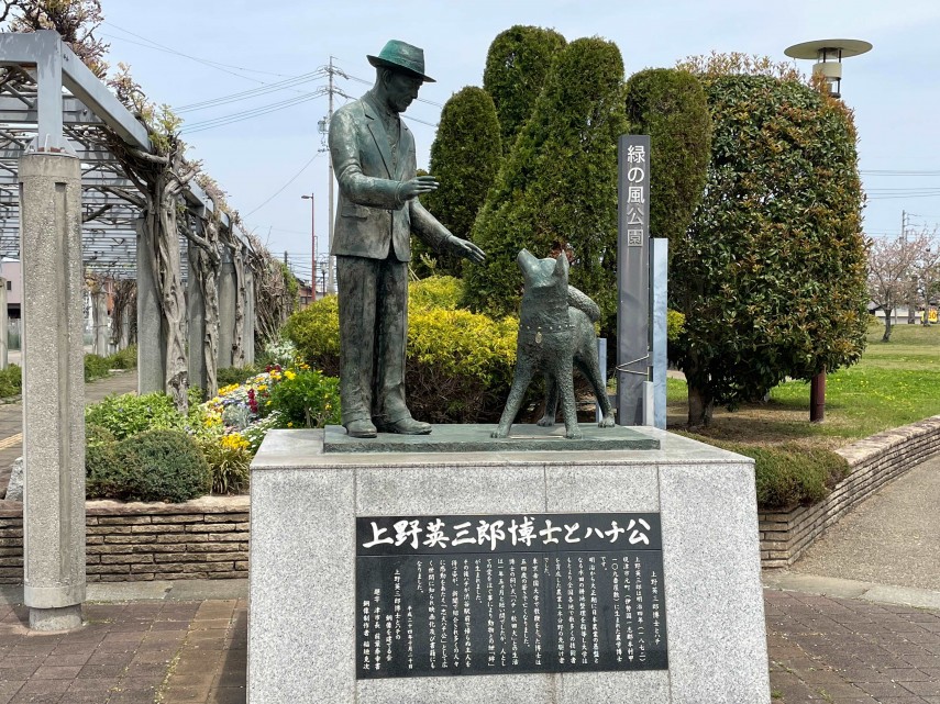 その上野博士とハチ公の像が三重県の近鉄名古屋線久居駅東口を出たすぐの「緑の風公園」にあります!