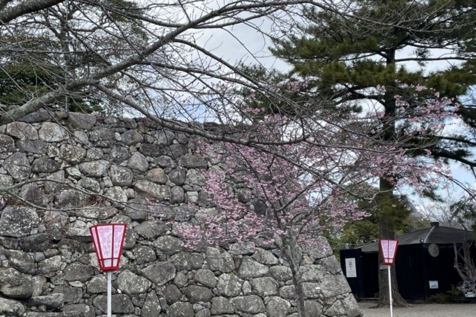 園内にはたくさんの桜が植えられており、満開の時期には「石垣」と「可憐な桜」という