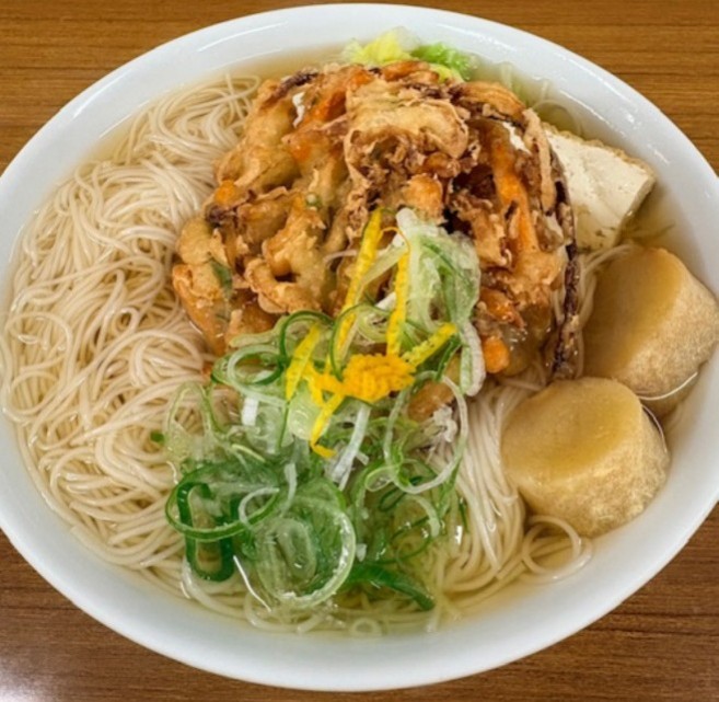 かき揚げも大きい!!厚揚げにお麩もありとっても豪華なにゅうめん。