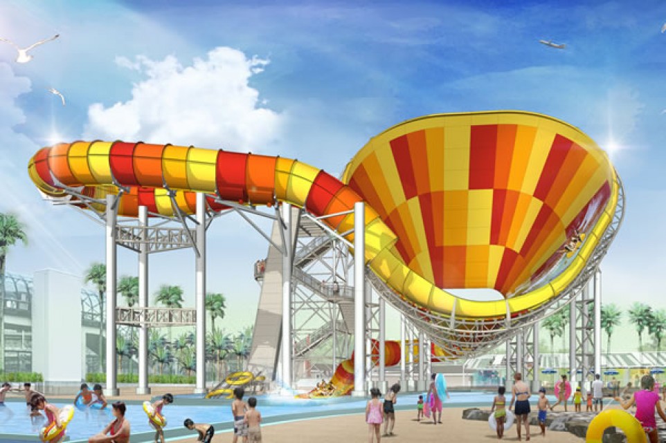 「MEGA」の名にふさわしい高さ約30メートル、幅約25メートルで巨大なラッパのような円すい形状のコースが特徴の世界最大級のウォータースライダーです!