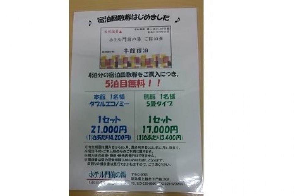 ホテル門前の湯では、この度ご利用の皆様がオトクにご宿泊いただける回数券を期間限定でご用意いたしました(・∀・)