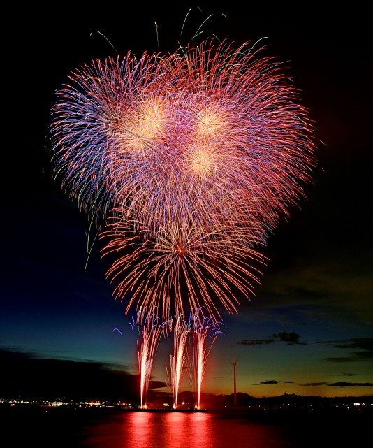 立地をいかして、海上に浮かべた台船から打ち上がる花火や、水中スターマインが鑑賞していただけます。