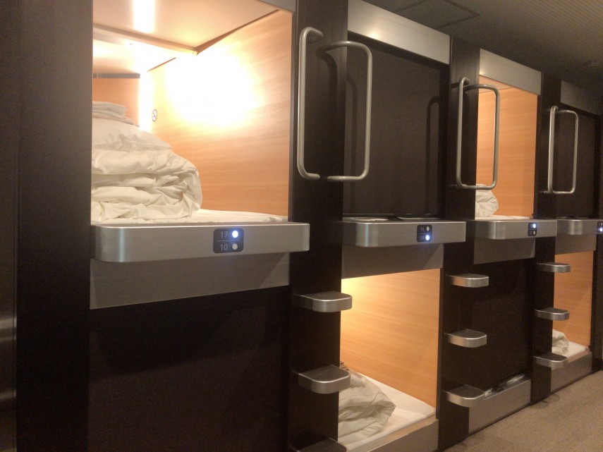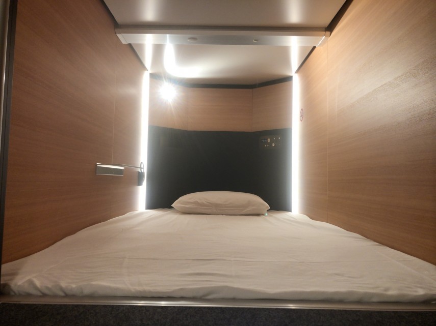当施設のカプセルホテルは、幅105cm、高さ100cm、奥行221cmとゆったりとした造りでございます。