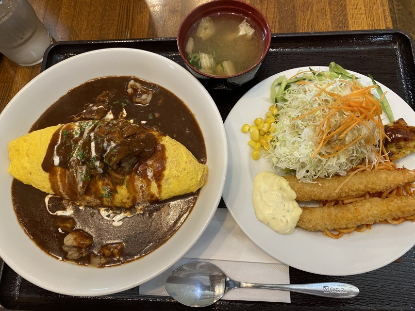 今回食べたのは、牛すじビーフシチューオムライス&エビフライセットです。