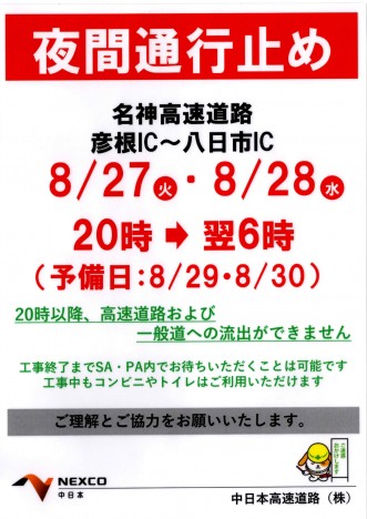 彦根IC~八日市ICが20時~翌6時まで夜間通行止めとなります。