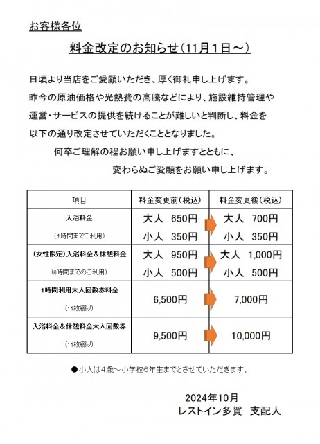平素はレストイン多賀をご利用いただきまして、誠にありがとうございます。