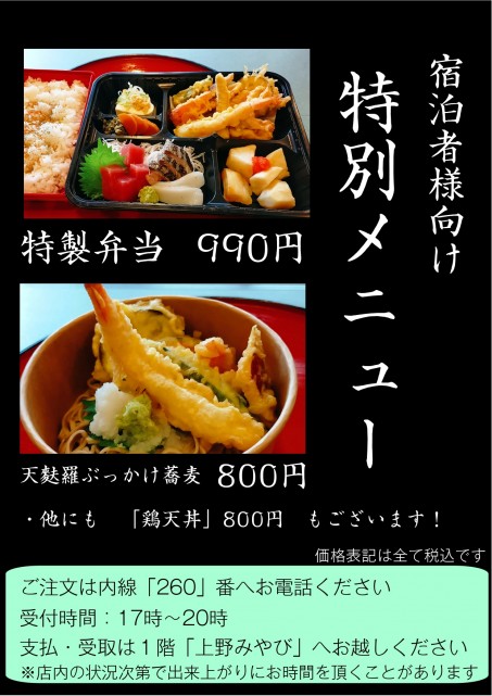 上野みやびでは、最近、宿泊者様特別テイクアウトメニューが出されました。