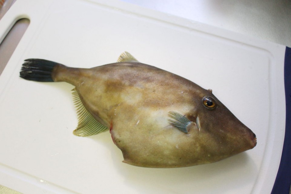 ウマヅラハギは全身が分厚い皮で覆われており、その皮を剥ぐと中から柔らかな白身が現れ、クセがなく淡泊、プリプリとした歯ごたえです。