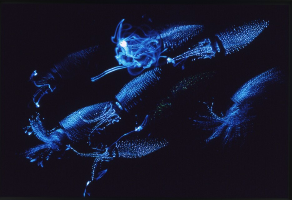 この現象はホタルイカが作り出しています。ホタルイカは自身が青白く光る、多くの謎に包まれた生物で、群れを成し、海面に放つ光は、まるで宝石のように美しいと言われています。