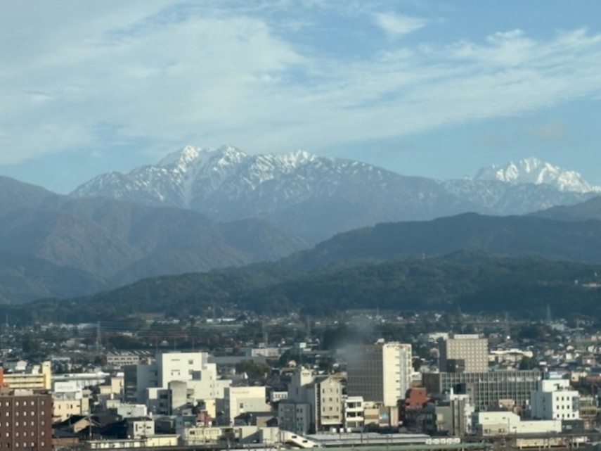立山連峰まで見渡せる絶景が広がります。春や秋の澄んだ空気の日は、特に美しいコントラストが楽しめます。