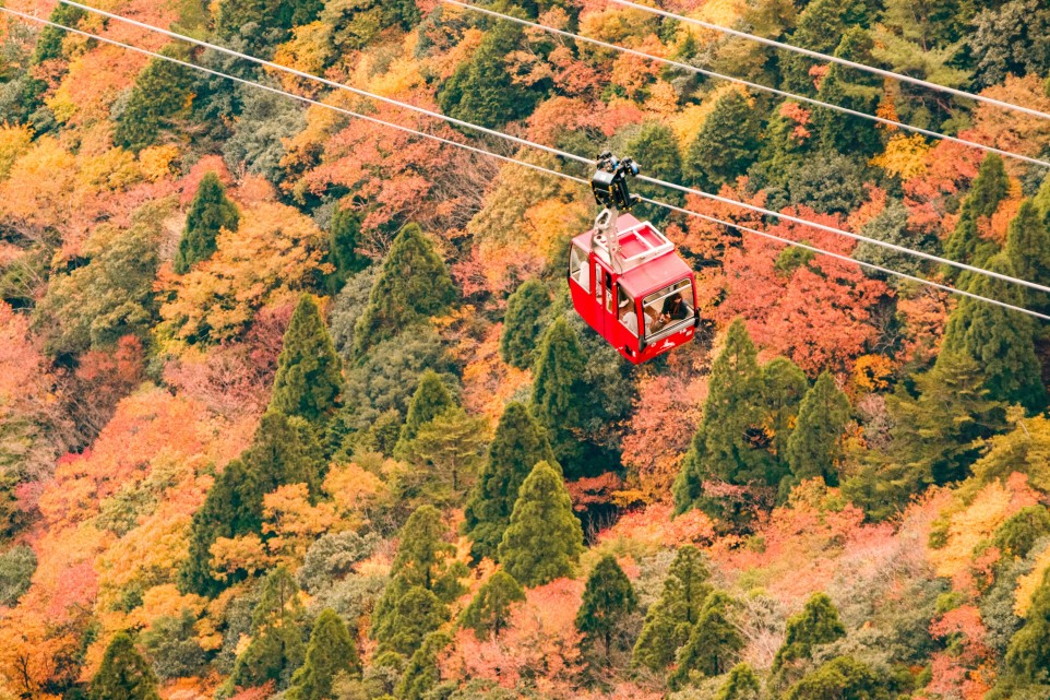 御在所岳は標高1,212m。ロープウェイに乗れば、色鮮やかな紅葉を眼下に眺めながら空中散歩を楽しめます。